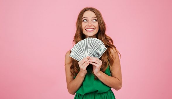 Portrait of a beautiful happy woman with long hair holding bunch of money banknotes and looking away at copy space isolated over pink background