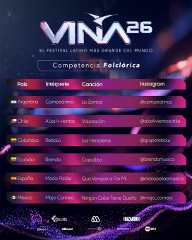 Los representantes seleccionados son: Colombia, con el grupo Rebolú; Argentina, con Campedrinos; Chile, con A los 4 Vientos; Ecuador, con Brenda Música; México, con Majo Cornejo; y España, con María Peláe. Todas estas presentaciones formarán parte de las jornadas del 22 al 27 de febrero en la Quinta Vergara, donde las delegaciones buscarán conquistar al público y al jurado en una de las competencias más tradicionales del Festival.