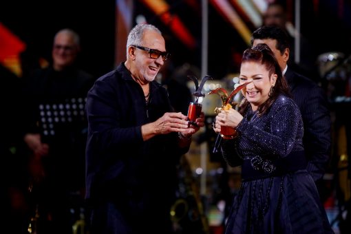 Emilio Estefan entrega la Gaviota de Oro a Gloria Estefan en la Quinta Vergara, durante la primera noche del Festival Internacional de la Canción de Viña del Mar 2026.